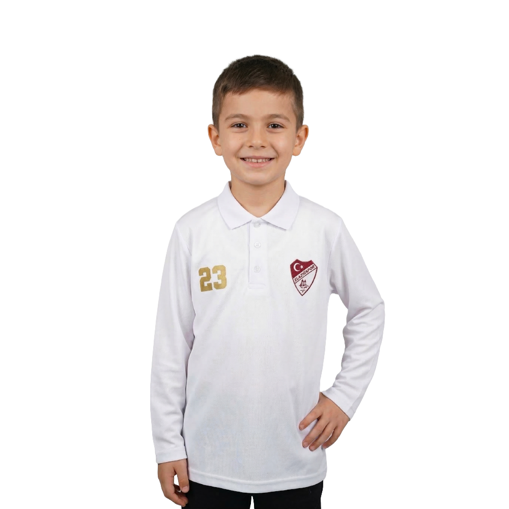 Küçük taraftarlar için özel olarak tasarlanan bu uzun kollu polo yaka , Elazığspor'un simgelerini ve şehrin plaka kodu olan 23'ü gururla taşır. Saf beyaz renkteki, nefes alabilen ve esnek kumaşıyla çocukların oyun ve aktiviteleri için konforludur.
